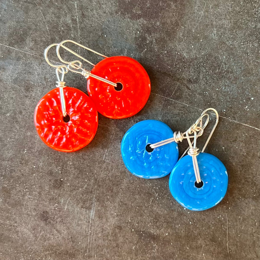 Art Glass Earrings - Puffy Discs Deep Aqua